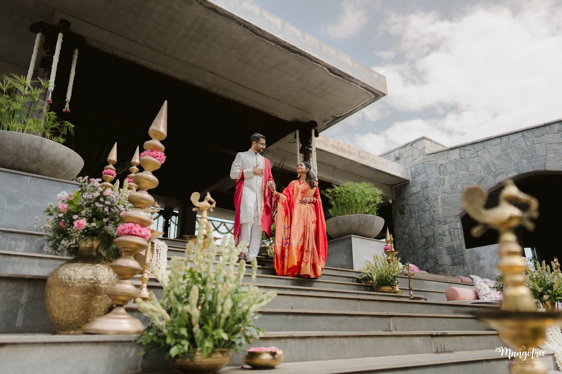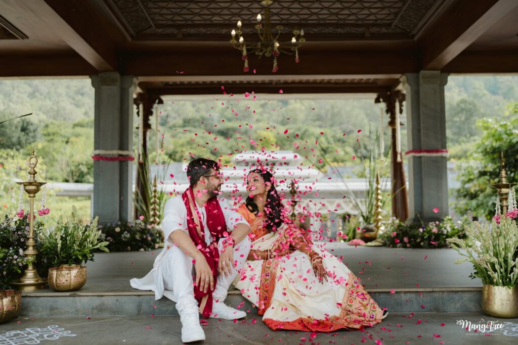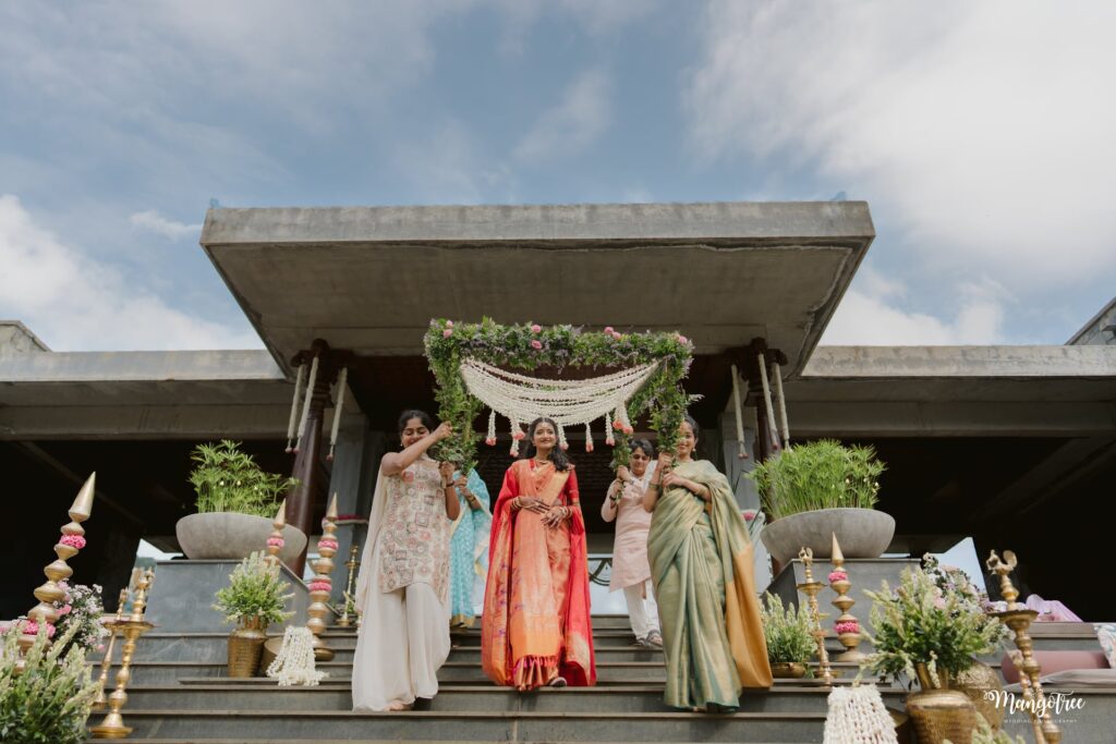 Surrounded by lush hills, natural light, and elegant architecture, their wedding beautifully blended South Indian traditions with modern minimal aesthetics. Every detail — from the floral mandap to the quiet emotional moments — created a timeless wedding story.